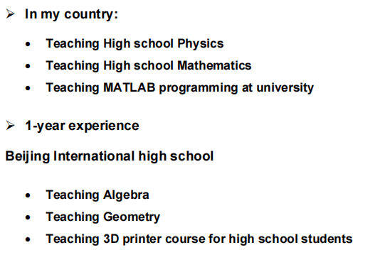 北航碩士,可以教英語,數(shù)學和物理,想去國際學校,薪資協(xié)商,6月份后上崗。 |