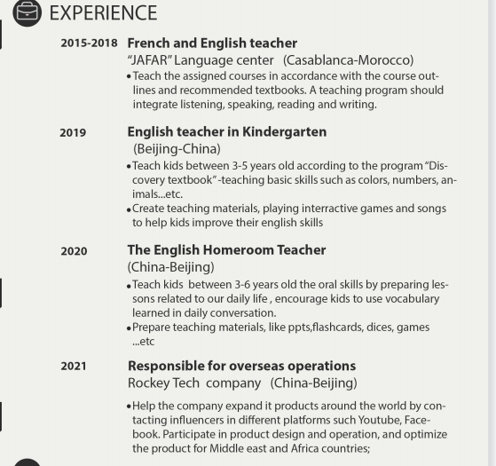kenza+摩洛哥女+本科+自理學(xué)生簽(可延期到2022.07)+求職北京,最好幼兒園+目前在北京,可下周到崗 |