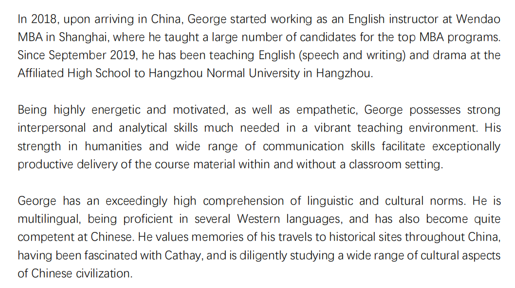 George,美國(guó),在杭州-高中,傾向于北方大學(xué),工簽轉(zhuǎn),求職八九月份職位 |