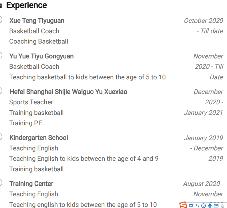 外教之前在培訓(xùn)和幼兒園工作過 既有英語(yǔ)教學(xué)經(jīng)驗(yàn) 也有籃球教學(xué)經(jīng)驗(yàn) 現(xiàn)在合肥 求職地不限制 可以盡快開始工作 |