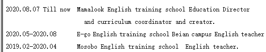 ,中國(guó),目前在寧波,計(jì)算機(jī)本科,兒童心理學(xué)本科在讀,TEFL,3年經(jīng)驗(yàn),求職上海南通幼兒園小學(xué),5-6k,下學(xué)期上崗 |