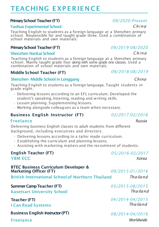 國籍: 英國 求職意向: 教師