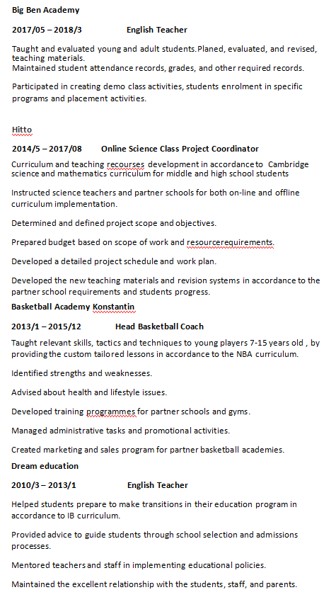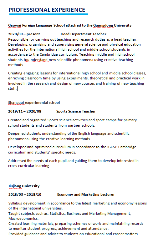 7年不同年齡層不同學(xué)科教學(xué)經(jīng)驗(yàn),出色的管理、口頭溝通和書面技巧 |