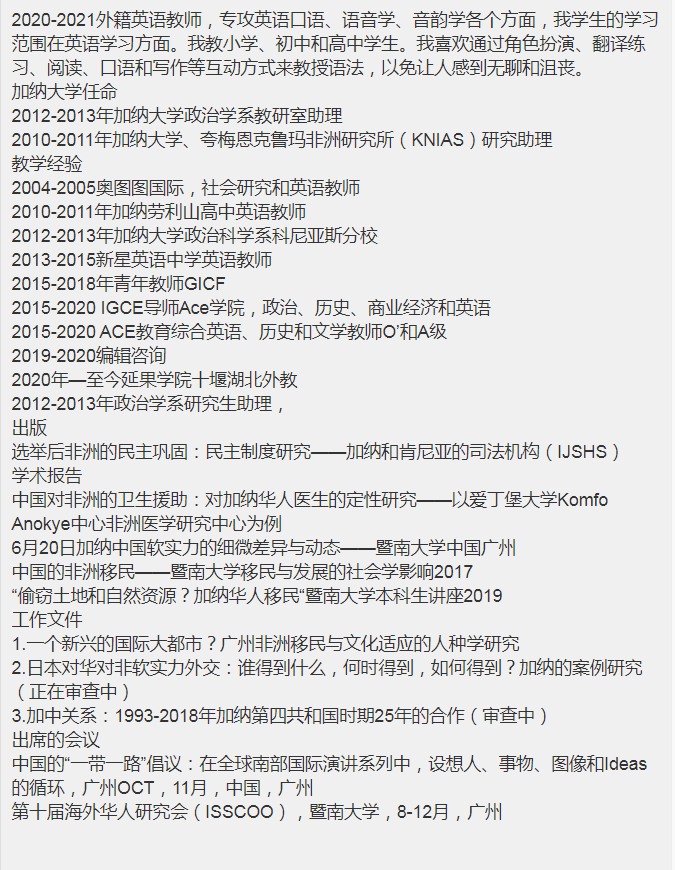 國籍: 喀麥隆 求職意向: 教師