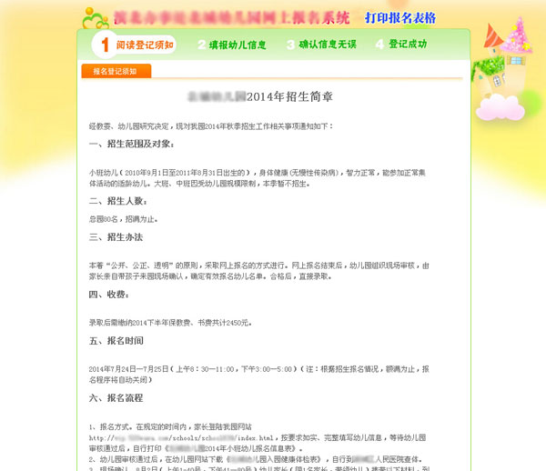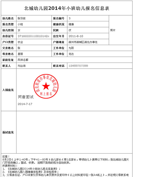 以上是園方回執(zhí)后,生成的打印頁面,家長打印后,憑此表格和其他資料在指定時間參加園方面試和繳納費用。