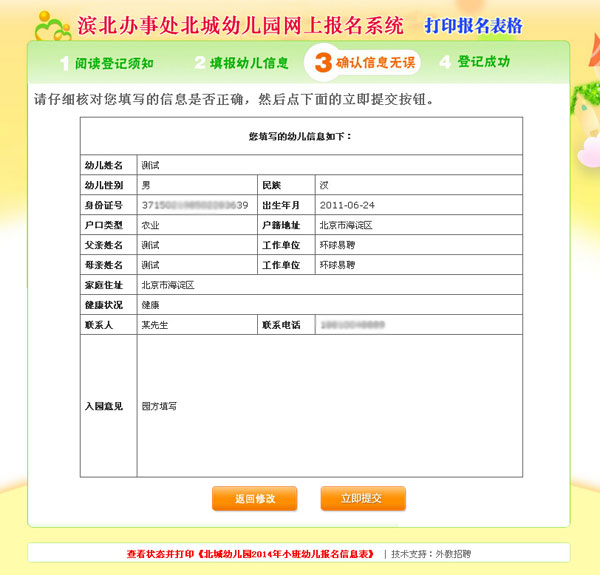 填寫完畢后,需要在確認頁面里面查看信息是否準確,家長確認信息無誤后,點擊立即提交按鈕,即可完成信息登記。這時短信版的報名系統(tǒng)會自動發(fā)送短信到家長,例如“尊敬的家長×××您好,您的孩子×××的報名信息我園已收到,我們會盡快審核并通知面試時間,請留意短信通知或在報名系統(tǒng)查詢狀態(tài)?!?/li>
