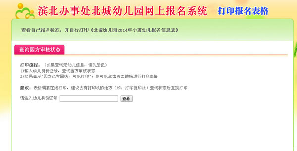 家長填寫信息后,可以在打印報名表格頁面查詢幼兒的報名狀態(tài)