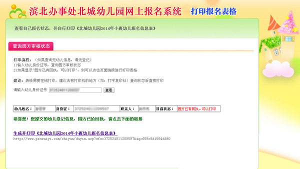 當報名狀態(tài)顯示園方已有回執(zhí),可以打印時,家長可以點擊鏈接進入打印表格頁面